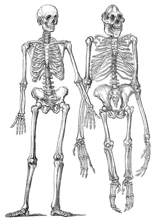 The whole conformation of Man displays that an erect position is proper to him, and that he can never maintain any other. The skull, nearly globose, rests on the spinal column, almost in an even balance; while the face, containing the chief organs of sense, occupies its frontal portion. The spine itself, enlarging to the lower extremity, is there connected with the pelvis, the form, strength, position, and broad expanse of which adapt it to support the superincumbent weight of the trunk; and this weight is now, by a beautiful mechanism, transmitted to the posterior extremities, which in the form of nearly perpendicular pillars, pursue the same general line of direction as the trunk. The articulations of the bones of the leg, both at its upper and lower extremities, are so constituted as to compel a vertical mode of progression; which is indicated also by the form and direction of the foot, by the mode in which the weight of the body is thrown upon the arch of the instep, by the projection of the heel for the attachment of the great muscles of the calf which raise the body in walking, by the breadth and flatness of the sole, and by the great toe, not having any power of opposing the others as a thumb, and therefore confining the use of the foot to that of an instrument of progression. The lateral breadth of the chest, throwing the shoulders wide apart, the mode in which the head of the shoulder is jointed to the blade, the structure of the elbow, fore-arm, and hand, the position of the heart and other viscera, the influx of blood to the head, not mitigated as in the brutes by subdivision of the arteries, as well as the form, comparative development, and arrangement of the muscles of various parts of his body, prove that Man is necessitated by his whole structure to assume that erect and commanding attitude, which is so becoming to him as a moral and intellectual being.