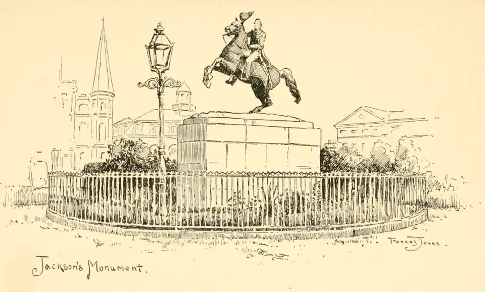 The improvements and renovations took at last a disastrous turn. Almonaster's cathedral was torn to the ground, and rebuilt with what was intended to be far greater art and magnificence; Mansard roofs were added to the Cabildo and convent. The Baroness de Pontalba, who was in the city at the time, improved her father's old pointed, red-tiled roofed Spanish buildings into the present French row, to be in harmony with the mansarded Cabildo and convent. The old Place d'Armes itself was improved into Jackson square, all vestige of grim-visaged war smoothed from it, planted in flowers and shrubs and (save the mark!) laid off in trim walks and neat bosquets; its old flag-staff taken down to give place to the equestrian statue of the hero of Chalmette.