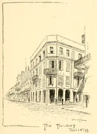 The De Boré town house was on Chartres and Conti streets, a massive brick building, with a large courtyard opening on Conti street, a true Spanish building; broad doorways, windows, rooms, hall, a staircase fit for a palace and beautiful enough for one, with its elaborate, fantastic, handwrought iron railing; the roof was a solid terrace, surrounded by a stone balustrade. It was afterwards owned by Madame de la Chaise. The Des Tréhans hotel stood opposite. Both have been demolished to make room for business buildings. But the house of Madame Porée, another member of the same family, still stands on the corner of Dumaine and Royal streets, looking just as it did on the brilliant December day when the little Charles Gayarré saw its iron-balustraded balcony filled with ladies, waving their handkerchiefs to the Creole troops hurrying down to the plains of Chalmette; or when, on the 8th of January, the roar of the cannon subsiding, hearts were beating every instant more fearfully and anxiously, the clatter of horses' feet was heard and women and children rushing out upon it as they did upon all the balconies around,—"Victory! Victory!" was shouted to them by a young Creole galloping through the streets.