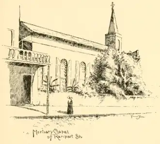 It was a hare and tortoise race between the Americans and the Creoles, and in the United States it is always the hare that wins. Before the Creoles were aware of it, the Faubourg Ste. Marie was not only a commercial rival of the vieux carré, but was proving a close competitor over her undisputed birthright, the expression of the religious and social life of the place; claiming separate churches, cemeteries, fine residences, and theatres. In 1805, as soon as the cession granted them freedom of worship, the Americans built a Protestant Episcopal church, Christ Church, on the outskirts of the city, the corner of Canal and Dauphine streets. Governor Claiborne worshipped in it, and, after his death, received a marble memorial in its churchyard. A truly venerable Gothic building it was, and so filled