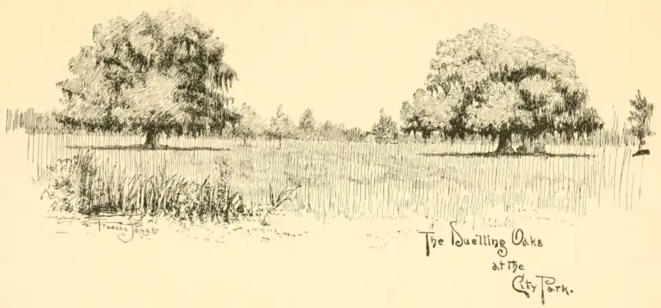 Within sight of the cemetery, a part of the same ridge of land, sinking into the same stretch of swamp, lies another relic of past time and civilization—the old duelling ground, now a park, a cemetery, too, in its way, although but one tomb stands there, that of its last owner, who, infatuated with love for his beautiful oaks, requested to be buried under the shadow of their branches. In the childish days of the city, when disputes were scarce, we hear of the officers drawing their swords and fighting for pastime in the moonlight on the levee; for other humours there were always quiet and retirement to be found anywhere outside of the city walls. When the emigrés from France and the islands arrived with their different times and different manners, and when the disbanded soldiers from Bonaparte's armies dropped into the population, there was as great a renaissance in duelling, as in the other condiments of life, so to speak. Fencing masters flourished, and "salles d'escrime" were the places of fashionable culture for young men. In Paris, gentlemen would step