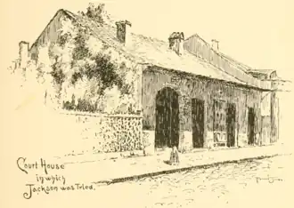 One can, in a morning's walk, go over the square, the vieux carré, as it is called, laid out by Le Blond de la Tour. The streets, fifty French feet wide, divide the cleared space into the sixty squares now comprised between Esplanade and Canal, Old Levee and Rampart streets; and their present names were given them, Chartres (below the cathedral), Condé, Royal Bourbon, Dauphine, Burgundy, and crossing them Bienville, Conti, St. Louis, Toulouse, St. Peter, Orleans, St. Anne (the two saints at the sides of the Cathedral, Orleans at its back), Dumaine and St. Philippe. Ursulines received its name later, from the convent. The barracks, or quarters of the soldiers, gave its name "Quartier," to the last street below the Place. The central blocks, fronting the river, were reserved for the parish church of St. Louis, with the priest house on its left and guard house and prison on its right. In front, was the Place d'Armes. The government magazines were on both sides of Dumaine street, between Chartres and the river. The rest of that block opening on the Place d'Armes, was then, as now, used as a market-place. Facing the levee between St. Peter and Toulouse streets, was situated the "Intendance," intendant's house. The house of the Company of the West was on the block above, and on the block above that was the Hôtel du Gouvernement, or governor's house. Bienville, however, built a private hotel on his square of ground, which included the site of the custom house of to-day. The powder magazine was placed on what would be now the neutral ground in front of the custom house. A view of the city, taken in 1718, about the time it was founded, for Le Page du Pratz, the historian, shows the levee shaded with trees, with buildings on both sides of the river, those opposite the city being on the plantation of the king, upon which Du Pratz afterwards served as physician. He said that the quarters given to the "bourgeois" (our first citizens) were overflowed three months of the year. He calls these blocks, therefore, "Islands; Isles," which is the origin of the Creolism "Islet" for street or square.