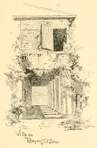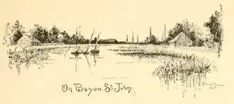 The list of the settlers' names made by Pauger is still printed on the margin of his map. Their houses soon dotted the squares about the central parade and market-place and on the river front, and a thin line of them extended back to the high road, the old portage, and to the bayou that connected with lake Pontchartrain. This little bayou, Tchoupic (Muddy), was christened St. Jean in honour of Bienville's patron saint. Meandering into the city from the lake, with slow, somnolent current, it is still the favourite water-way for the leisurely traffic of sailing craft. In the time of the Company of the West, the whole stream of emigration to the Mississippi lands flowed through it: the gaping eye of French peasant and Parisian cockney taking in, despite the lapse of a century and a half, the general features of the same panorama that to-day passes, with their dreams, before the half-closed eyelids of the Dago and Malay fishermen, reclining on the decks of their schooners;—low, rush-covered banks fringing into the water, moss-laden oaks, and the buttressed trunks of slimy cypresses. But the rush-covered banks of to-day extended then into vast swamp prairies, athrill with life, and scintillating with the light and colour of the low-lying heavens. The moss-covered oaks were forests, arching their shades into majestic mystery and solemnity; the buttressed trunk of that single cypress, and those straggling clumps of palmettoes, were then a tropical jungle, choking in the coils of its own inbred growth of vines.