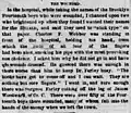 The Wounded. In the hospital, while taking the names of the Brooklyn Fourteenth boys who were wounded, I chanced upon two who brightened up when they found I wanted their names for the Herald, and said they "used to type" on that paper. Charles F. Webber was standing in front of the hospital, holding his hand, from which the ends of all four of the fingers had been shot, smoking his pipe with the most provoking nonchalance. I asked him why he did not go in and have his wounds dressed. He guessed there was enough in there worse than him to keep Dr. Farley busy. "The hooks have got to come off and I can wait. They are nothing but sore fingers." I went in, and sure enough there was Surgeon Farley cutting off the leg of James Woodward, of Company C. There were over fifty of the Fourteenth boys there wounded, many of whom fell into the hands of the enemy when we left the town.