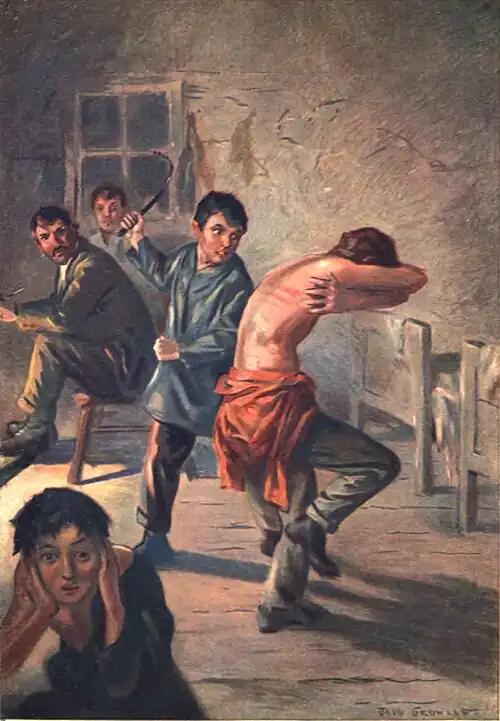 Ricardo, the child who had lit the second match, took down from the wall a short-handled whip with two leather-knotted straps. Meanwhile, the boy who was short two sous was unfastening his coat. Then he dropped his shirt, baring his body to the waist.