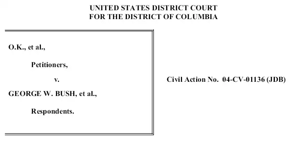 Accordingly, petitioners' emergency motion to compel the government to allow an independent medical evaluation and to produce medical records is denied. /s/ JOHN D. BATES United States District Judge Dated: October 26, 2004 -30- Copies to: The Honorable Joyce Hens Green Mainer I. Ahmad Richard J. Wilson AMERICAN UNIVERSITY WASHINGTON COLLEGE OF LAW 4801 Massachusetts Avenue, NW Washington, DC 20016 (202) 274-4140 Fax: (202) 274-0659 Robert D. Okun Chief, Special Proceedings Section 555 Fourth Street, Northwest Room 10-435 Washington, D.C. 20530 202-514-7280 (telephone) Robert J. Katerberg Terry Marcus Henry Vincent M. Garvey Joseph H. Hunt Preeya M. Noronha U.S. DEPARTMENT OF JUSTICE Civil Division, Federal Programs Branch 20 Massachusetts Avenue, NW Washington, DC 20001 (202) 616-8298 (202) 514-4107 Fax: (202) 616-8460 UNITED STATES DISTRICT COURT FOR THE DISTRICT OF COLUMBIA O.K., et al., Petitioners, v. Civil Action No. 04-CV-01136 (JDB) GEORGE W. BUSH, et al., Respondents. ORDER Upon consideration of petitioners' emergency motion to compel the government to allow an independent medical evaluation and to produce medical records, it is for the reasons stated in the memorandum opinion issued on this date hereby ORDERED that the motion is DENIED. /s/