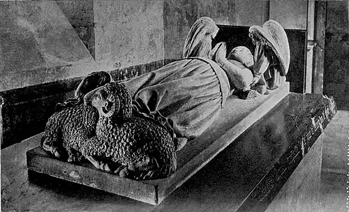 Etienne Chevalier was for some time secretary to the king, and after filling one or two smaller posts connected with finance, was made Treasurer of France, and member of the Grand Council. In addition to administrative capacity, he possessed a brilliant intellect and a great love of art. It is to his initiative that we owe the only suggestions in portraiture of Agnes Sorel. It was to him also that the king confided the supervision of the erection of the monuments to her memory at Jumièges and Loches—Jumièges where she died in 1449, and where her heart was buried, and Loches her favourite place of sojourn, and to whose church and chapter she had made large gifts. To Loches her body was borne in royal splendour, and there laid to rest in the choir of the church in a simple tomb. We can imagine the loving care with which Etienne Chevalier watched the sculptor, and possibly even gave him suggestions, as he fashioned in alabaster her recumbent effigy representing her with hands clasped as if in prayer, her feet resting against two lambs, and her head guarded by two angels with out-stretched wings. Perhaps this stone effigy was the one true portrait of Agnes, but the head and face were partially destroyed during the Revolution, and restored in their present form in 1806, so that little of the original now remains.