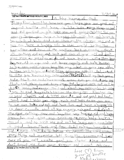 to my dear brothe how are you i hope you are good and in great health. and how is life hope evrything is good. and did you find a job hope soo and gangtatulation for you mariag i hope you have a happy life with her and hope to have lots of kids and raise them on the Islamic way and so you can have a happy life in this world before the hereafter and how is the weather back in Canada. I think it is getting cooler. Take good care of your self and don't give mom or grandma or paand have patience with them because they are old in age and visit home regularly and help Kareem so he can walk again. By the way what is your new address so I can write to you writing granma's address. And I wanted to ask you because my interrogator (HASOSE) told me that you sade that we rode horses with Usama's kids. You did you say that and this is not true. May God forgive you and write back soon and [redacted] about my interrogator. He says hi and congratulations on the marriage. About me I am in good health and do a little exercise and eat good and feel good and I miss you very much and hope to see you soon so we can talk and eat and have fun and have a happy life in dear Canada and all my injuries are good and about my eye nothing new and by the way happy Eid and happy Ramadhan and give my greetings to everyboyd back in Canada and to write to me and not be lazy, even one letter is good from them, and dear Abdul Rahman fear God and know that He is looking at you all the time everything and memorise lots from the Quran and take care of yourself make good use of your time and don't forget me from your prayers and I wont. Take care