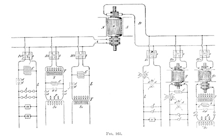 In the diagrammatical sketch, Fig. 1/165, which has been already referred to, the cases which are most likely to be met with in practice are illustrated. One has at his disposal either direct or alternating currents from a supply station. It is convenient for an experimenter in an isolated laboratory to employ a machine G, such as illustrated, capable of giving both kinds of currents. In such case it is also preferable to use a machine with multiple circuits, as in many experiments it is useful and convenient to have at one's disposal currents of different phases. In the sketch, D represents the direct and A the alternating circuit. In each of these, three branch circuits are shown, all of which are provided with double line switches s s s s s s. Consider first the direct current conversion; la represents the simplest case. If the E. M. F. of the generator is sufficient to break through a small air space, at least when the latter is warmed or otherwise rendered poorly insulating, there is no difficulty in maintaining a vibration with fair economy by judicious adjustment of the capacity, self-induction and resistance of the circuit L. containing the devices l l m. The magnet N, S, can be in this case advantageously combined with the air space, The discharger d d with the magnet may be placed either way, as indicated by the full or by the dotted lines. The circuit la with the connections and devices is supposed to possess dimensions such as are suitable for the maintenance of a vibration. But usually the E. M. F. on the circuit or branch la will be something like a 100 volts or so, and in this case it is not sufficient to break through the gap. Many different means may be used to remedy this by raising the E. M. F. across the gap. The simplest is probably to insert a large self-induction coil in series with the circuit L. When the arc is established, as by the discharger illustrated in Fig. 2/166, the magnet blows the arc out the instant it is formed. Now the extra current of the break, being of high E. M. F., breaks through the gap, and a path of low resistance for the dynamo current being again provided, there is a sudden rush of current from the dynamo upon the weakening or subsidence of the extra current. This process is repeated in rapid succession, and in this manner I have maintained oscillation with as low as 50 volts, or even less, across the gap. But conversion on this plan is not to be recommended on account of the too heavy currents through the gap and consequent heating of the electrodes; besides, the frequencies obtained in this way are low, owing to the high self-induction necessarily associated with the circuit. It is very desirable to have the E. M. F. as high as possible, first, in order to increase the economy of the conversion, and secondly, to obtain high frequencies. The difference of potential in this electric oscillation is, of course, the equivalent of the stretching force in the mechanical vibration of the spring. To obtain very rapid vibration in a circuit of some inertia, a great stretching force or difference of potential is necessary. Incidentally, when the E. M. F. is very great, the condenser which is usually employed in connection with the circuit need but have a small capacity, and many other advantages are gained. With a view of raising the E. M. F. to a many times greater value than obtainable from ordinary distribution circuits, a rotating transformer g is used, as indicated at IIa, Fig. 1, or else a separate high potential machine is driven by means of a motor operated from the generator G. The latter plan is in fact preferable, as changes are easier made. The connections from the high tension winding are quite similar to those in branch la with the exception that a condenser C, which should be adjustable, is connected to the high tension circuit. Usually, also, an adjustable self-induction coil in series with the circuit has been employed in these experiments. When the tension of the currents is very high, the magnet ordinarily used in connection with the discharger is of comparatively small value, as it is quite easy to adjust the dimensions of the circuit so that oscillation is maintained. The employment of a steady E. M. F. in the high frequency conversion affords some advantages over the employment of alternating E. M. F., as the adjustments are much simpler and the action can be easier controlled. But unfortunately one is limited by the obtainable potential difference. The winding also breaks down easily in consequence of the sparks which form between the sections of the armature or commutator when a vigorous oscillation takes place. Besides, these transformers are expensive to build. It has been found by experience that it is best to follow the plan illustrated at Met, In this arrangement a rotating transformer g, is employed to convert the low tension direct currents into low frequency alternating currents, preferably also of small tension. The tension of the currents is then raised in a stationary transformer T. The secondary s of this transformer is connected to an adjustable condenser C which discharges through the gap or discharger d d, placed in either of the ways indicated, through the primary P of a disruptive discharge coil, the high frequency current being obtained from the secondary s of this coil, as described on previous occasions. This will undoubtedly be found the cheapest and most convenient way of converting direct currents.