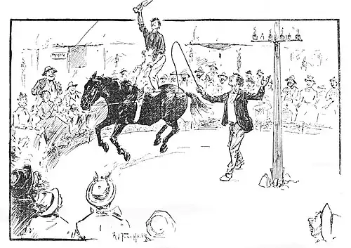 When the commotion subsided Paddy Maloney rang the cow-bell again, and Dave and "Podgy," the pet sheep, rode out on Nugget. Podgy sat with hind-legs astride the horse and his head leaning back against Dave's chest. Dave (standing up) bent over him with a pair of shears in his hand. He was to shear Podgy as the horse cantered round.