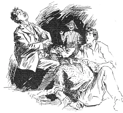 "Hold the light down here, missis—a little lower. You gentlemen" (to Canty and Dave) "look after his legs and arms.