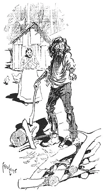 But one day Jack did get out, and, while Mother and Sal were ironing, came to the door with the axe on his shoulder. They dropped the irons, and shrank into a corner and cowered piteously—too scared even to cry out.