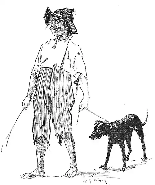 And such a man! Tall, bony, heavy-jawed, shaven with a reaping-hook, apparently. He had a thick crop of black hair—shaggy, unkempt, and full of grease, grass, and fragments of dry gum-leaves. On his head were two old felt hats—one sewn inside the other. On his back a shirt made from a piece of blue blanket, with white cotton stitches striding up and down it like lines of fencing. His trousers were gloom itself; they were a problem, and bore reliable evidence of his industry. No ordinary person would consider himself out of work while in them. And the new-comer was no ordinary person. He seemed to have all the woe of the world upon him; he was as sad and weird-looking as a widow out in the wet.