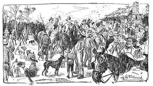 Dave, showing a neat seat, rode out of the yard on Bess, fresh and fat and fit to run for a kingdom. They awaited Dad. He was standing beside his mount—Farmer, the plough-horse, who was arrayed in winkers with green-hide reins, and an old saddle with only one flap. He was holding an earnest argument with Joe. . . . Still the crowd waited. Still Dad and Joe argued the point. . . . There was a murmur and a movement and much merriment. Dad was coming; so was Joe—perched behind him, "double bank," rapidly wiping the tears from his eyes with his knuckles.