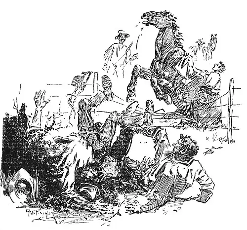 Joe became afraid. He clutched at the saddle and cried "Let me off!" "Stick to him!" said Paddy Maloney, hopping over the fence, "Stick to him!" He kicked Farmer what he afterwards called "a sollicker on the tail." Again he kicked him. Still Farmer strained and hung back. Once more he let him have it. Then—off flew the winkers, and over went Dad and Anderson and old Brown, and down rolled Joe and Farmer on the other side of the fence. The others leant against their horses and laughed the laugh of their lives. "Worse'n a lot of dd jackasses," Dad was heard to say. They caught Farmer and led him to the fence again. He jumped it, and rose feet higher than he had any need to, and had not old Brown dodged him just when he did he would be a dead man now.
