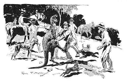 Dad shook his head and looked grave—so did Anderson. After a short rest they decided to divide into parties and work the ridges. A start was made. Dad's contingent—consisting of himself and Joe, Paddy Maloney, Anderson, old Brown, and several others—started a mob. This time the dogs separated and scampered off in all directions. In quick time Brown's black slut bailed up an "old man" full of fight. Nothing was more desirable. He was a monster, a king kangaroo; and as he raised himself to his full height on his toes and tail he looked formidable—a grand and majestic demon of the bush. The slut made no attempt to tackle him; she stood off with her tongue out. Several small dogs belonging to Anderson barked energetically at him, even venturing occasionally to run behind and bite his tail. But, further than grabbing them in his arms and embracing them, he took no notice. There he towered, his head back and chest well out, awaiting the horsemen. They came, shouting and hooraying. He faced them defiantly. Anderson, aglow with excitement, dismounted and aimed a lump of rock at his head, which laid out one of the little dogs. They pelted him with sticks and stones till their arms were tired, but they might just as well have pelted a dead cow. Paddy Maloney took out his stirrup. "Look out!" he cried. They looked out. Then, galloping up, he swung the iron at the marsupial, and nearly knocked his horse's eye out.