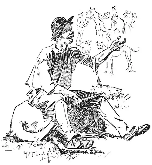 Poor Dad! He was at a disadvantage; his legwork was hampered. He was hobbled. Could he only get free of them altogether! But he couldn't—his feet were large. He took a lesson from the foe and jumped—jumped this way and that way, and round about, while large drops of perspiration rolled off him. The small dogs displayed renewed and ridiculous ferocity, often mistaking Dad for the marsupial. At last Dad became exhausted—there was no spring left in him. Once he nearly went down. Twice he tripped. He staggered again—down he was going—down, down—and down he fell! But at the same moment, and, as though they had dropped from the clouds, Brindle and five or six other dogs pounced on the "old man." The rest may be imagined.
