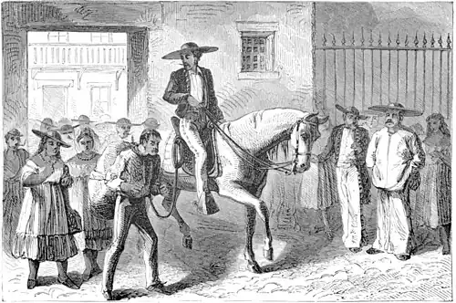 The officer then told the woman to roll the clothing in a bundle and tie it up, which was done; then he ordered the thief to take it in his hand and carry it, which he refused to do. Thereupon he made a loop in the cord, and passing it over the neck of the thief, compelled him to carry it upon his back. As he mounted his horse, his attendant attached the lariat on his saddle to the cord with which the elbows of the culprit were tied, and told him to vamos! instanter. The officer rode off on horseback, with the thief at the end of his lariat carrying the bundle on his back, and walking by the side of the horse, the woman who owned the clothing and those who were wanted for witnesses following him, and the policeman on foot bringing up the rear. That evening the woman returned with the clothing, and brought word that the thief had been tried, convicted, and sentenced to six months in the chain-gang.