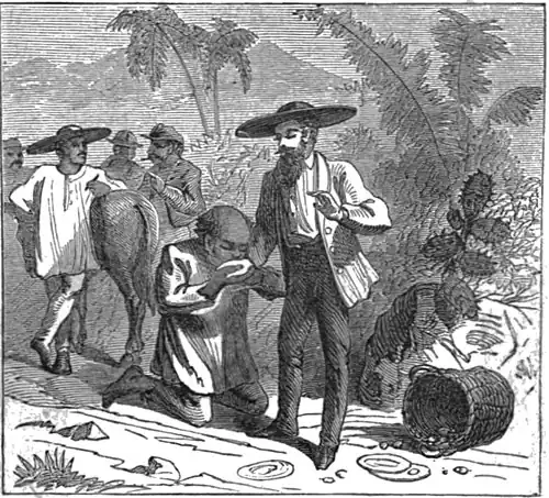 The soil in this vicinity is a dark red earth, which resembles that of the gold belt of the Sierra Nevada, and is tenacious to the last degree when wet up by the rains, and worked into brick material by the wheels of vehicles. We passed during this day, a poor little village at which the butcher Rojas captured eighty men—all the able-bodied male population of the vicinity—and murdered them all in cold blood, some years since.
