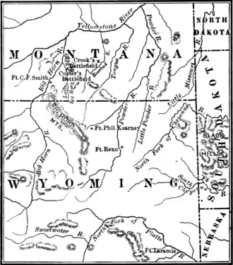 from the California trail, in the vicinity of Fort Laramie, across by way of the Powder River valley to the gold mines in Montana and Idaho. This road was necessarily run through the richest buffalo range left to the Sioux Indians. Red Cloud was then fast coming into prominence as the principal chief of the Oglala Sioux. The construction of the road was intrusted to Colonel Sawyer, and he began work with a party of surveyors and an escort of only twenty-five men, from Company B of the Dakota Cavalry. Red Cloud met