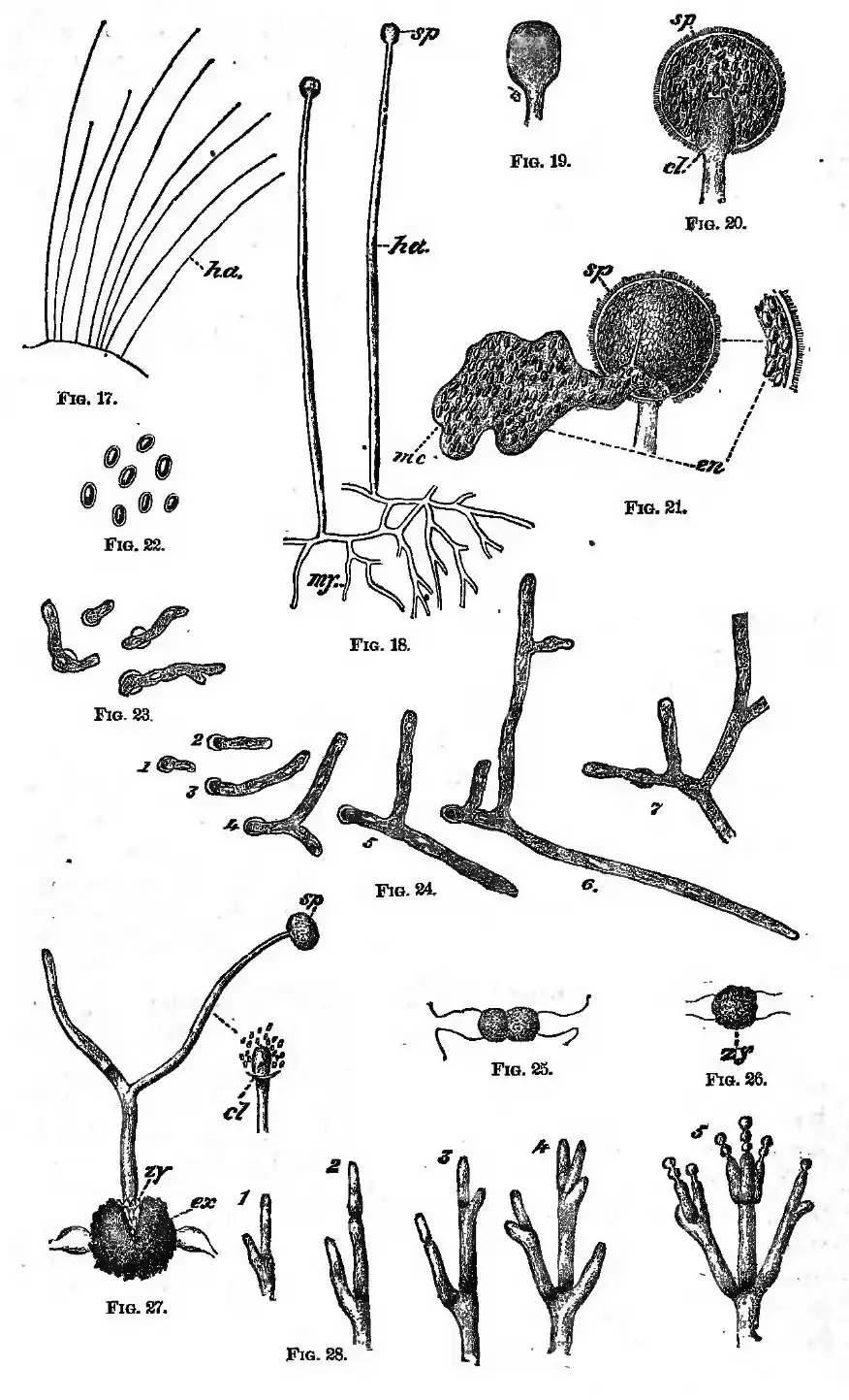 Fig. 17.—Spore-bearing hyphæ of Mucor, growing from horse-dung.