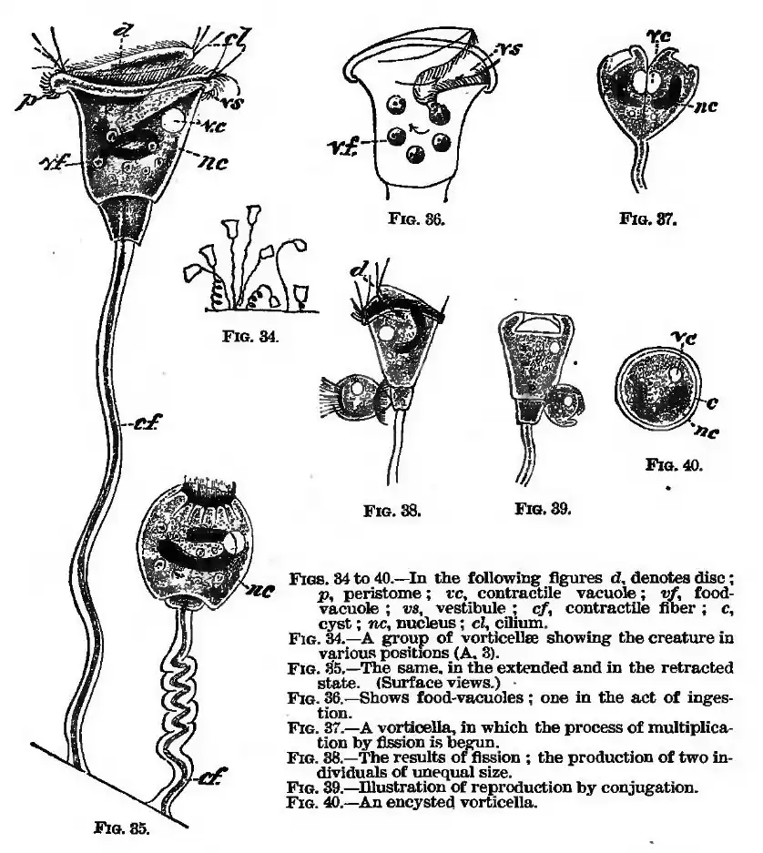Fig. 34.—A group of vorticellse showing the creature in various positions (A. 3).