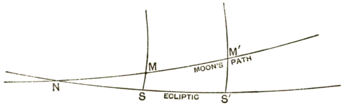 to be near one of the nodes (n), as at s m in fig. 26, the sun and moon will be so close together that an eclipse will occur; but if it occurs at a considerable distance from a node, as at s' m', their centres are so far apart that no eclipse takes place.