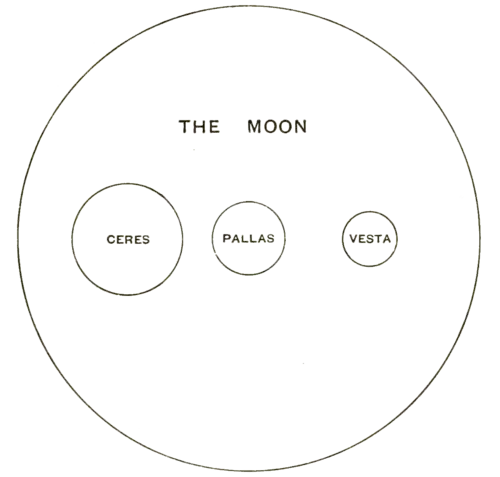 of any of the discs which seem reliable are those of Professor E. E. Barnard, made at the Lick Observatory in 1894 and 1895; according to these the three largest minor planets, Ceres, Pallas, and Vesta, have diameters of nearly 500 miles, about 300 and about 250 miles respectively. Their sizes compared with the moon are shewn on the diagram (fig 90). An alternative method—the only one available except for a few of the very largest