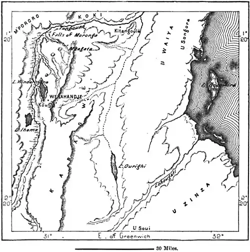 The kingdom of Karagwé occupies west of Lake Victoria an area of about 6,000 square miles, being limited southwards by U-Zinza, west and north by the Tanguré