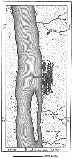 Suakin, or Sawakin, is the safest port on the Red Sea coast, and resembles that of Massawah in its geographical position. The riverain zone of coral banks is pierced by a winding channel which penetrates over 2 miles inland, terminating in an oval-shaped basin about 1 mile from north to south. To the west are sand-banks which contract the sheet of water, and are continued by shallows overgrown with reeds. Two round islands, partially fringed with rocks, exceed the level of the basin by several feet. One of these islands, that of Sheikh Abdallah, is used exclusively as a cemetery; the other, farther south, comprises the town of Suakin, properly so-called. The chief port lies between these two islands, but vessels of the heaviest tonnage can also anchor north of the island of Sheikh Abdallah; in this species of lake, which seems to be surrounded by land on all sides, vessels are perfectly safe from the winds and surf. The port, opened in the midst of a beach rendered very dangerous by the multitude of reefs, is well worthy the name of the "harbour of the protecting gods," which many authors believe to have been given it during the time of the Ptolemies.