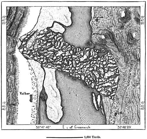 series of cataracts. One of these groups of rapids, known as the "fourth cataract," is of considerable length, and is divided into many stages like a series of sluices. First comes Dulga Island, a high rock crowned by a ruined fortress; then follow other granite boulders visible above the water, but without interrupting the navigation. This first barrier is succeeded by islands and sandbanks, followed by more rocks, dividing the river into steep channels, and the gorge ends near Gerendid, in a sort of gateway formed by two rocks covered with the ruins of fortresses. Here are no trees like those on the fifth or the third cataract situated below New Dongola, not a patch of verdure on the bank to soften the wild grandeur