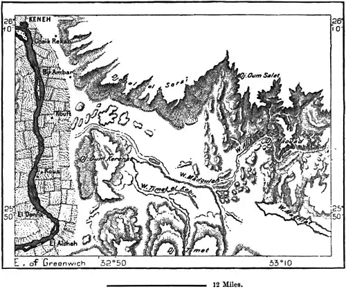 Near Keneh, 36 miles below Thebes, the Nile describes that great curve which brings it nearest to the Red Sea. At this point it is distant from the coast, in a straight line, not more than 60 miles. Precisely in this direction the eastern range is broken by one of the deepest transverse ravines occurring throughout its whole course, and it may be asked whether, in some remote geological epoch, the Nile