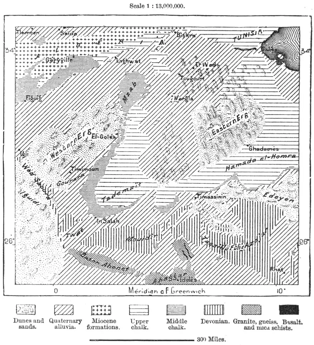 Egueleh, the block lying nearest to the Wed Righ, is encircled on the east, north, and west by the Edeyen, or "Sands." The Khanfusa eminence (1,940 feet), the first Devonian rock occurring on the route from Tugurt to Ideles, in the