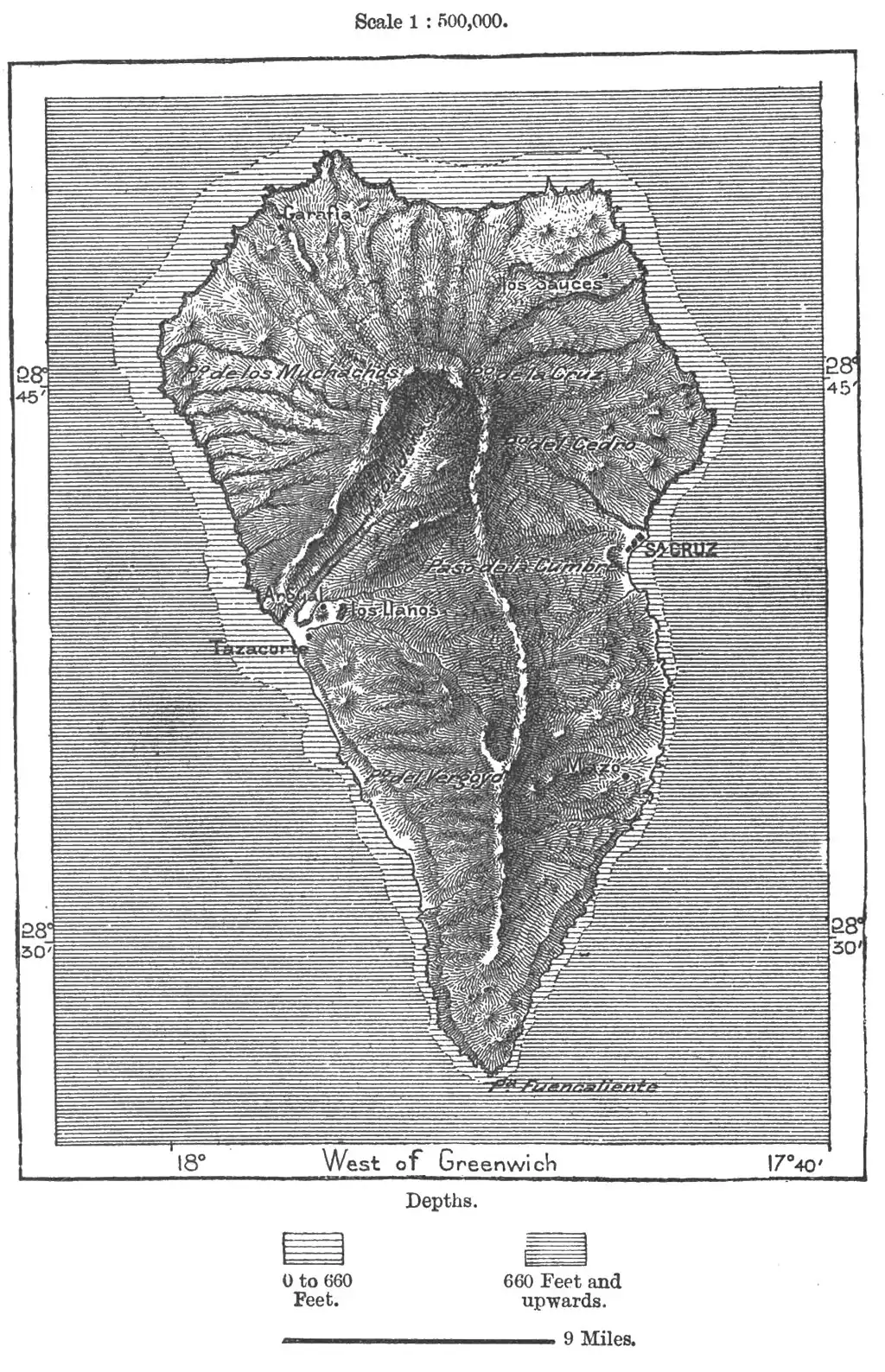 Of all the Canary islands, Gomera abounds most in cascades, thanks to its abundant waters and steep precipices. Near Chipude, the highest village in the island (4,000 feet), a rivulet falls 650 feet into the Argaga gorge, while the