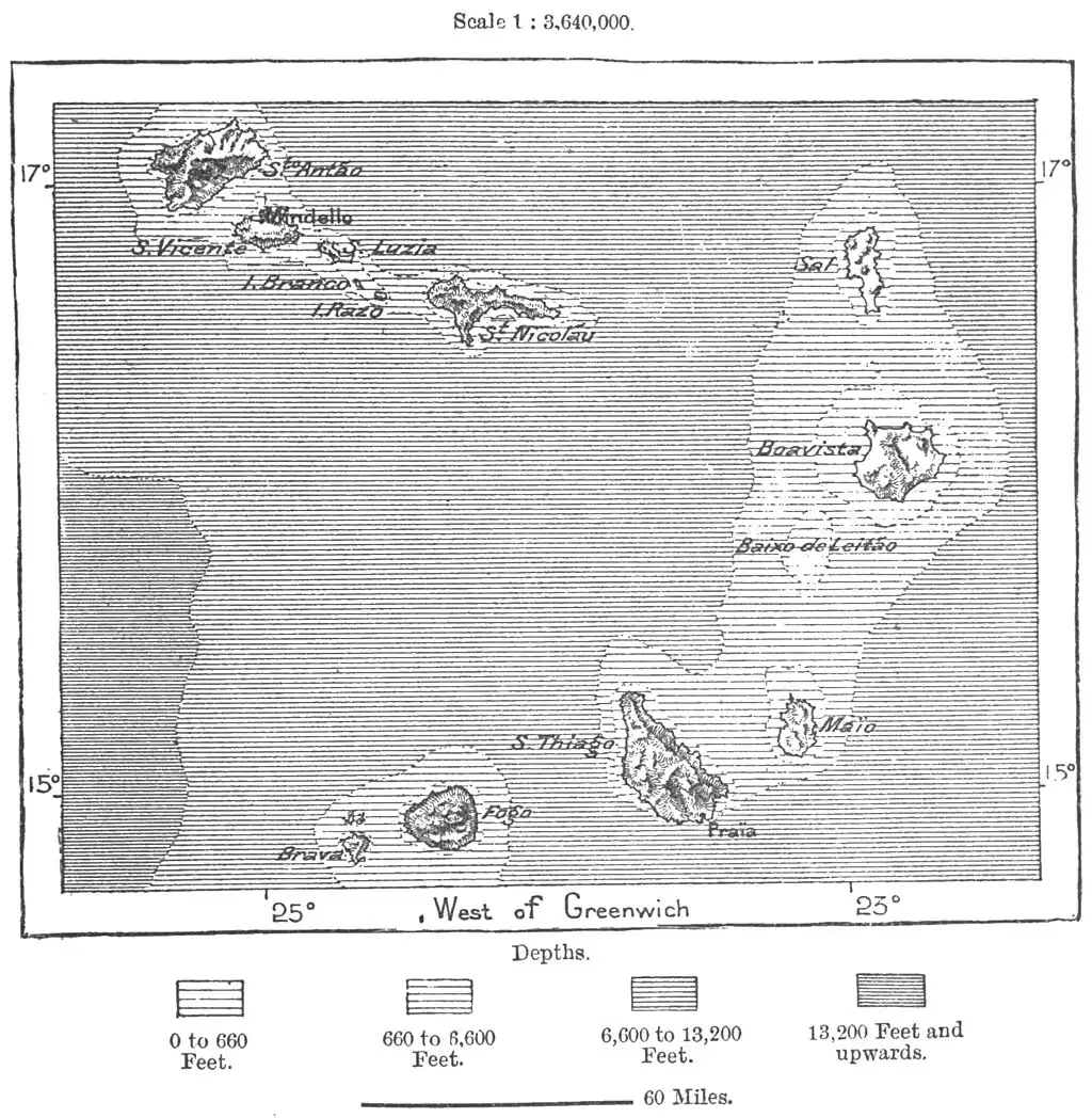 The Cape Verd archipelago seems to belong to an older geological epoch than the almost exclusively volcanic Canaries and Azores. All the islands have no doubt their craters and eruptive rocks, while Santo-Antam and Fogo consist exclusively of scoriæ and lavas. But in the others are also found crystalline rocks, granites, syenites, and "foyaite," so called from Mount Foya in Algarve. Fine metamorphic marbles and sedimentary rocks also occur, and Maio is especially remarkable for the relative extent of its non-igneous formations, a fact which certainly favours the theory of an Atlantic continent formerly occupying these waters.