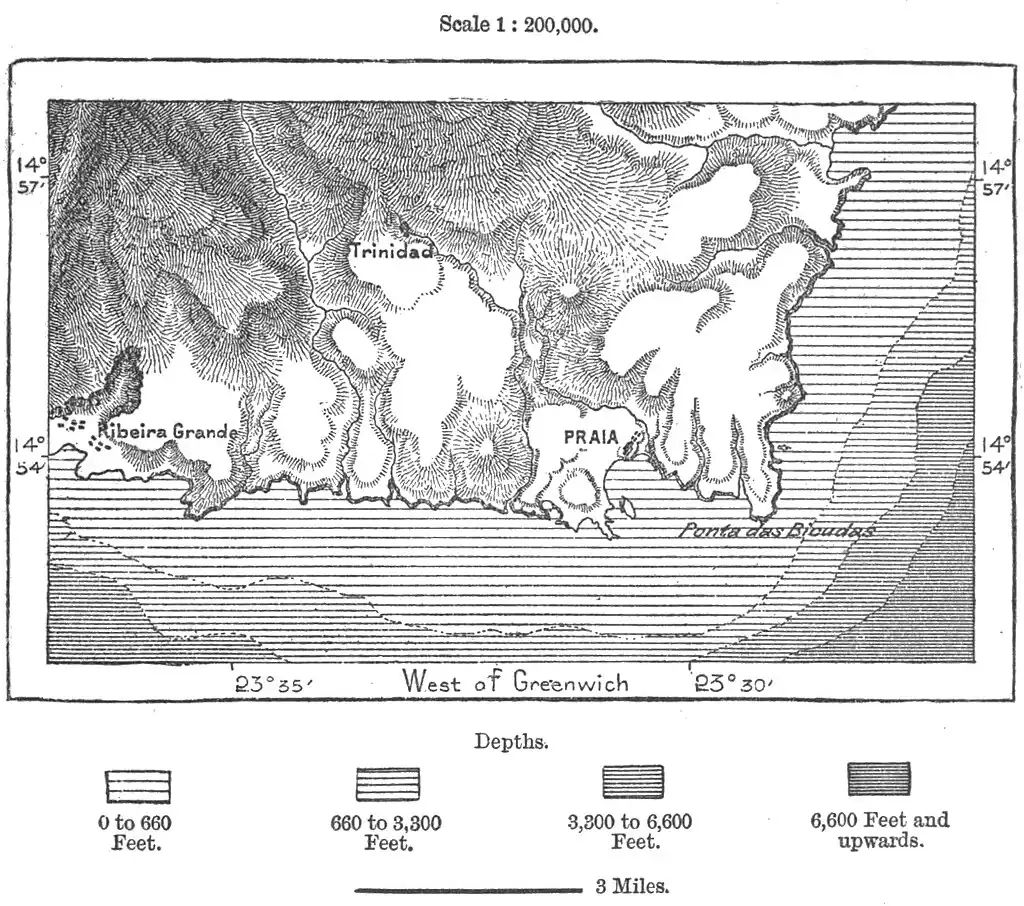 Of Ribeira-Grande, the former capital, little remains except its name. It was badly situated on a small pebbly stream, with a hot southern aspect, cut off from the refreshing northern breezes by the inland mountains. But although captured and nearly ruined by the French in 1712, it still retained the official title of capital till the year 1770, when it was replaced by Villa da Praia. This place lies on a semicircular bay on the south-east coast exposed to the south winds, and a meteorological observatory has here been established. There is a small natural history