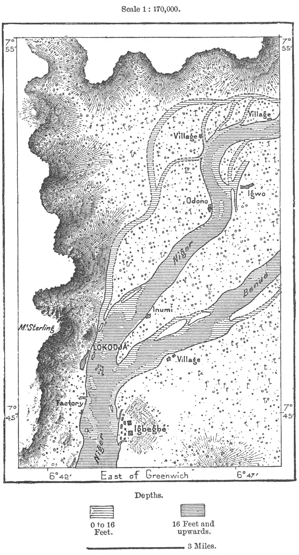 navigation impossible in the dry season. But it is soon swollen by numerous affluents from the Wangara hills in the north, and from the south by the Faro (Paro), a copious stream descending from the still unexplored regions beyond Adamawa, and sweeping round the east foot of Mount Alantika, one of the