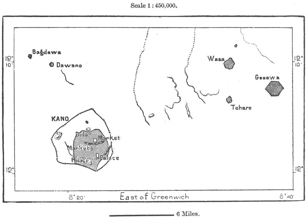 follow Duchi, lost amid a labyrinth of rocks; Sansané Aïssa, one of the strongest places in the empire; Alkalawa, formerly capital of Gober, on the banks of the Sokoto at the northern verge of the dense forest of Gundumi; lastly, Konni, one of the chief places in Gober, two days to the north-west.
