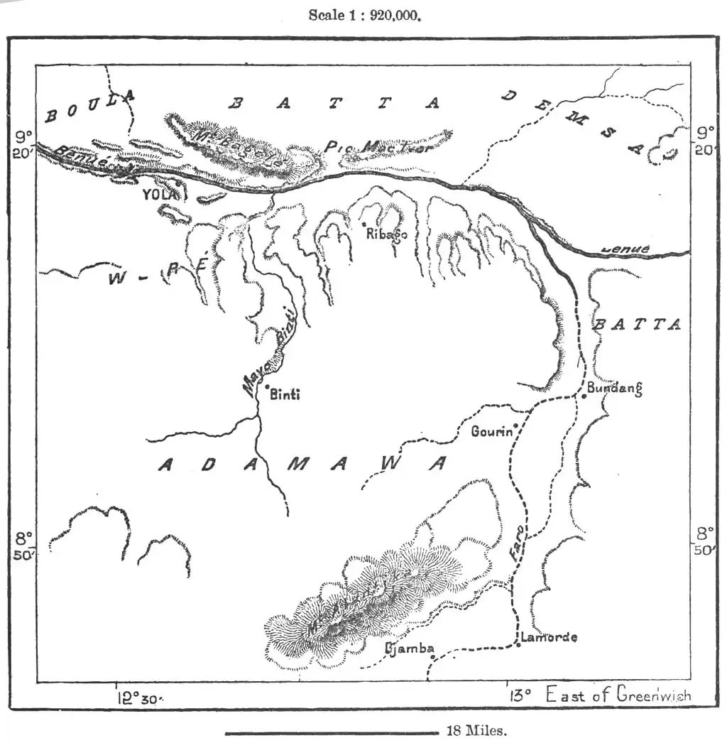 Towards its source the Benue basin is separated from that of the Tsad by a scarcely perceptible water-parting; but towards the north the divide between its affluents and the Kaduna river is formed by plateaux dominated by some of the loftiest mountains in North Africa. These highlands are separated by intervening