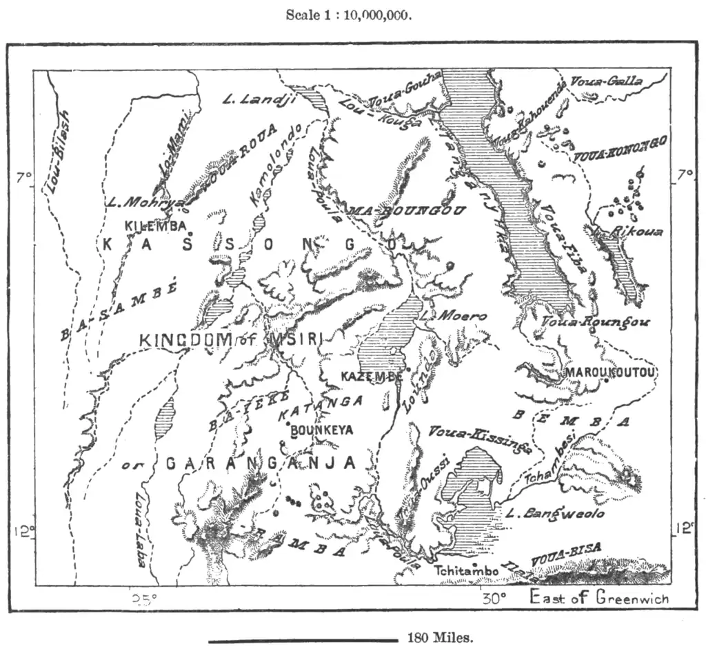 The U-Rua country is one of the richest in the interior of Africa. The soil is extremely fertile, and in the mountains are found deposits of iron, cinnabar, silver, and even rock-oil. Most of the natives are distinguished by their intelligence and skill as craftsmen, and Cameron describes a native cabin which would be a work of art even in Europe. Much artistic taste is also displayed in the marvellous head-dresses, the endless varieties of which reveal the special character of each individual. Each clan has also a special animal, whose spoils supply the gala robes worn when they present themselves before their sovereign. As in the