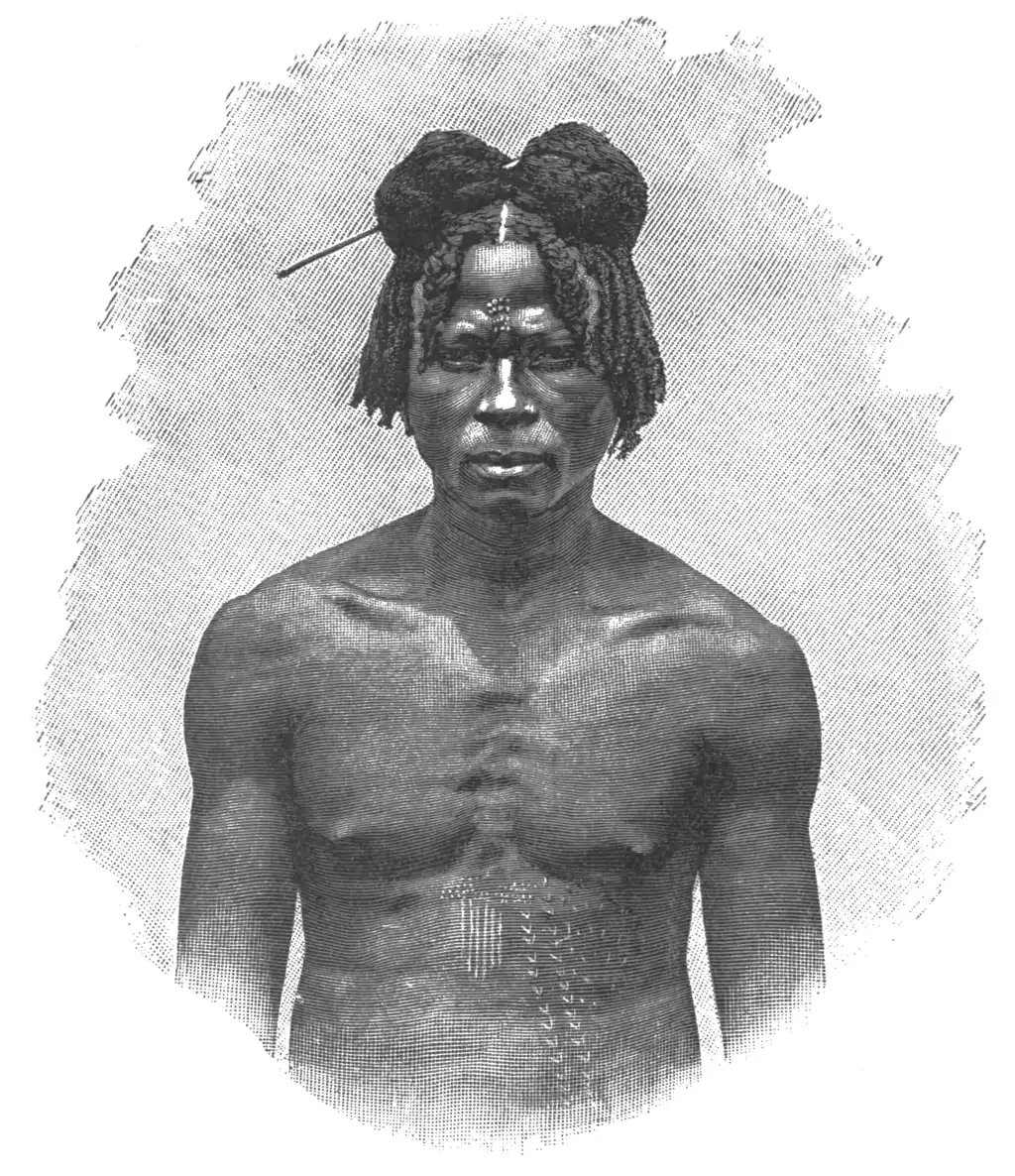 The Zandehs are round-headed, with straight nose, wide nostrils, full cheeks and lips, round and almost feminine features, an effect which is heightened by their peculiar style of head-dress. Their kinky hair is remarkable for its great length, some wearing tresses which reach down to the waist, while many are furnished with a dense beard much longer than that of any other Negro or negroid peoples. The female head-dress is much more simple than that of the men, who spend whole