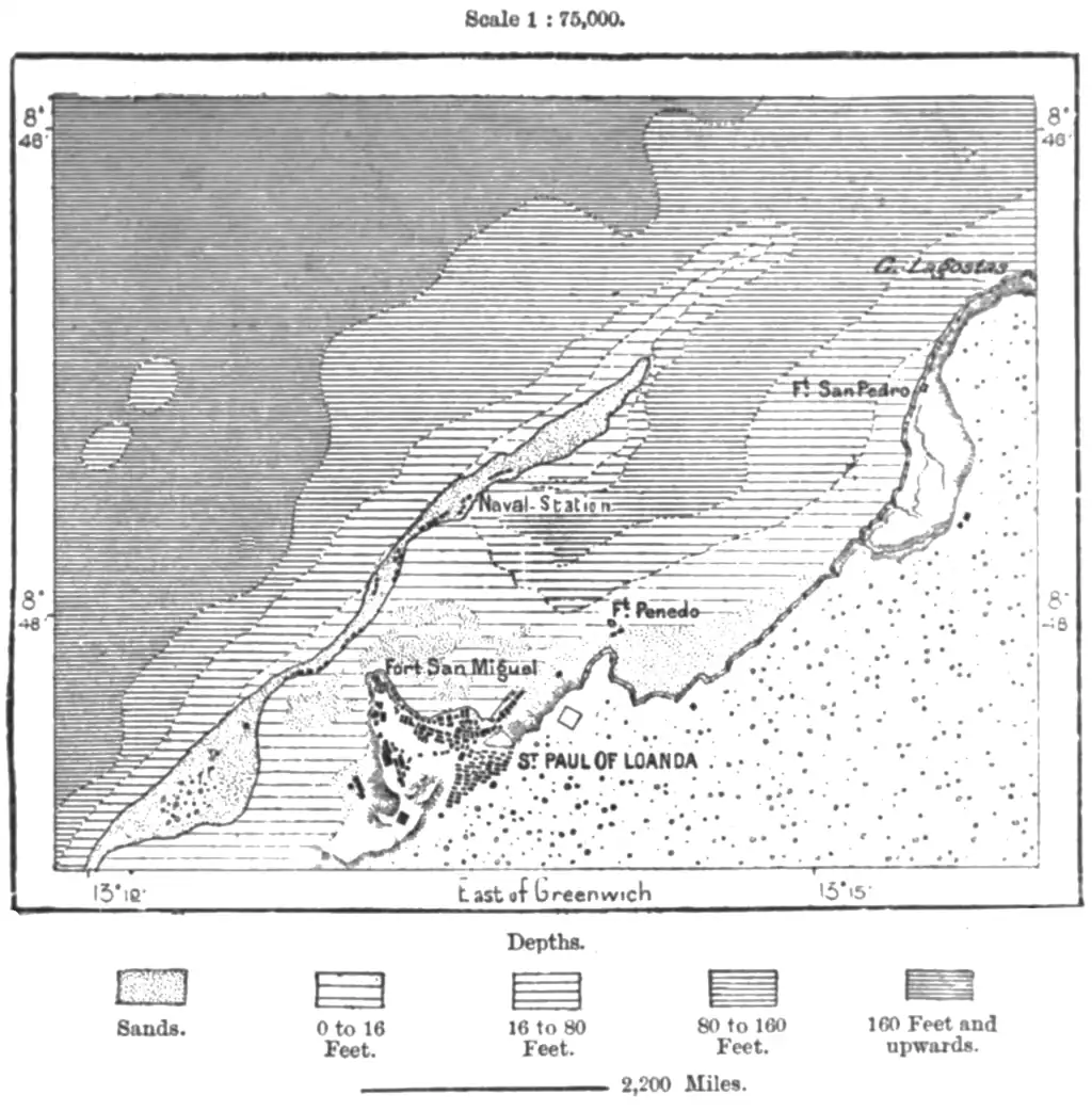 grandson of the navigator who first doubled the Cape of Good Hope, secured a footing on the neighbouring coast, where by alliances with native chiefs and successful wars, the Portuguese gradually acquired possession of the surrounding territory. As a chief centre of the slave trade between Africa and Brazil, Loanda became a wealthy and populous city, where from twelve to fifteen vessels might at times be seen awaiting their turn to ship their living cargoes. But after the suppression of this traffic, itself a hindrance to the development of all legitimate trade, Loanda was all but ruined. Its population fell off, its buildings were forsaken, all business came to an abrupt end; the few remaining inhabitants, cut off