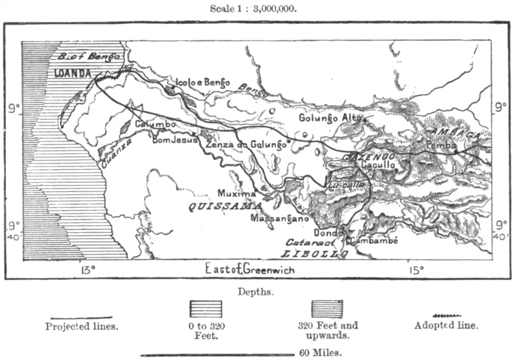 mines, which occur a little farther up near the cataracts of the Cuanza, and not far from the village of Cambanibé. The first attempt was made to secure possession of these mines in the year 1595, when the two hundred men forming the expedition were all massacred except seven, who escaped to report the disaster.