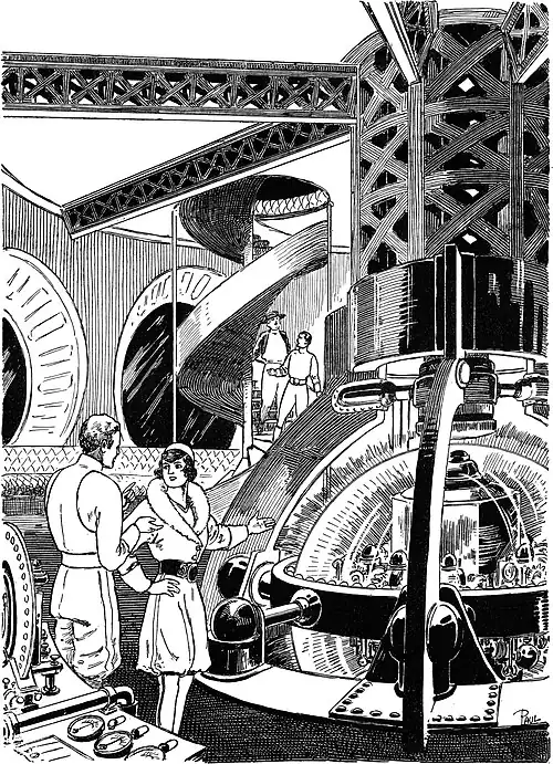 In the exact center of the huge shell was a spherical network of enormous steel beams. Inside this structure could be seen a similar network which, mounted upon universal bearings, was free to revolve in any direction.