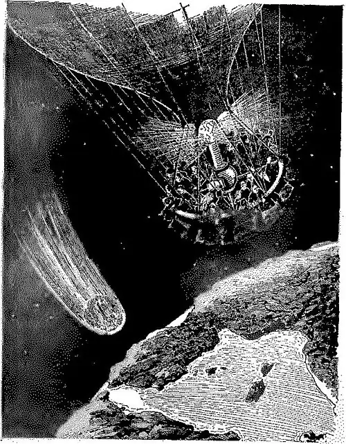 A wirework stove, suspended below the casing, and filled with lighted hay, served to keep the air in the interior of the balloon at n proper temperature.