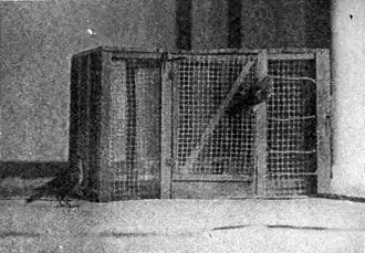 It was true many times that the female Cowbird did not come down at all until the door was opened. The Sparrow thus continued to open the door. A female English Sparrow was turned into the cage on the 77th test and a little later still another one. They served to distract him since he tended to follow them in their running around the box. If anything his fear which was constantly increasing was enhanced by their presence.