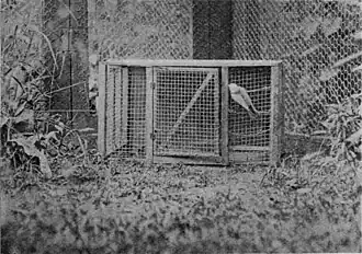 just done. In the 35th, the 48th and the 55th tests she opened the door in much the same manner as both had done previously. According to my notes the correspondence between the behavior of these two birds is close, but there is little proof that one changes its behavior because of the example set by the other. Fig. 15.