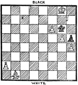 should be made for Black, but only with the White pieces. Mr. White accepted, but to his dismay found it utterly impossible to win the game under such conditions. Try as he would, he could not checkmate his opponent. On