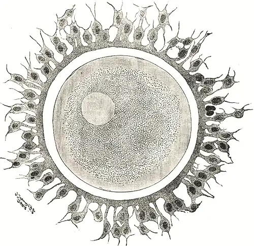 parent envelope, the zona striata or zona pellucida, adhering to the outer surface of which are several layers of cells, derived from those of the follicle and collectively constituting the corona radiata.