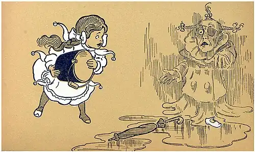 was all that was left of the old woman, she cleaned and dried it with a cloth, and put it on her foot again. Then, being at last free to do as she chose, she ran out to the court-yard to tell the Lion that the Wicked Witch of the West had come to an end, and that they were no longer prisoners in a strange land.